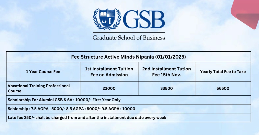 Graduate School of Business Indore Certification Vocational Training Professional Course is offered as 1 Year Full Time program. The minimum eligibility criteria for Certification is 10+2. The total fees for Graduate School of Business Indore Certification Vocational Training Professional Course in 2025 is ₹ 56,500 for the complete course duration, which includes total tuition fees of ₹ 56,500.