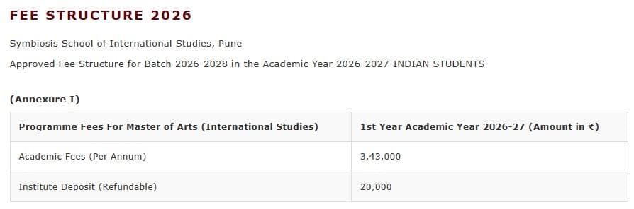 Earlier, MA International Studies fees at Symbiosis School of International Studies Pune was ₹ 6.86 Lakhs (in 2024) for the entire course duration. This shows a fee increase of ₹ 20,000 over the year.