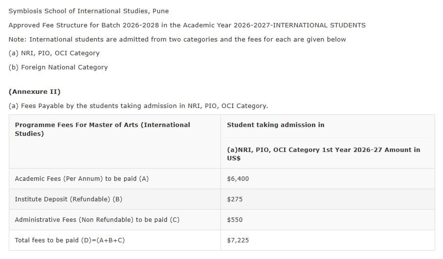 Symbiosis School of International Studies Pune MA International Studies fees 2025 is ₹ 7.06 Lakhs for the entire course duration.