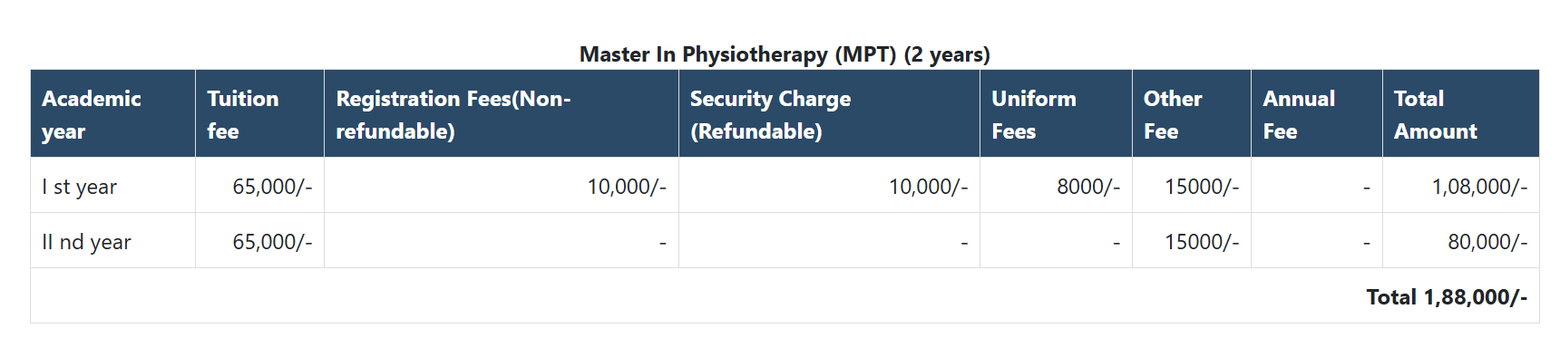 DIMS Dehradun M.P.T fees in first year is ₹ 1.08 Lakhs. The detailed fees is mentioned below.DIMS Dehradun Hostel Fee is ₹ 1.08 Lakhs to 1.58 Lakhs.