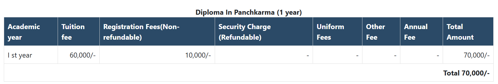 DIMS Dehradun Diploma Panchkarma is offered as 1 Year Full Time program. The minimum eligibility criteria for Diploma is 10+2 with 50%. The total fees for DIMS Dehradun Diploma Panchkarma in 2025 is ₹ 70,000 for the complete course duration, which includes total tuition fees of ₹ 60,000. Earlier, the fees in 2024 - 2025 for Diploma Panchkarma was ₹ 70,000.