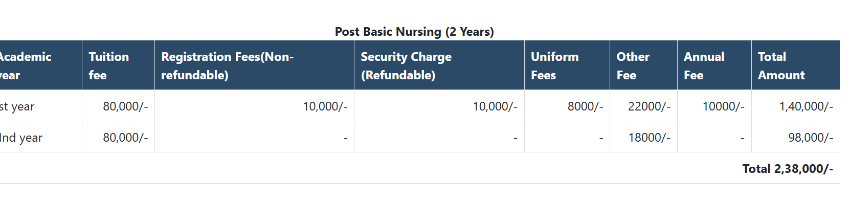 DIMS Dehradun P.B.B.Sc Nursing is offered as 2 Years Full Time program. The minimum eligibility criteria for P.B.B.Sc is 10+2 with PCB. The total fees for DIMS Dehradun P.B.B.Sc Nursing in 2025 is ₹ 2.38 Lakhs for the complete course duration, which includes total tuition fees of ₹ 1.6 Lakhs. Earlier, the fees in 2024 - 2025 for P.B.B.Sc Nursing was ₹ 2.38 Lakhs.