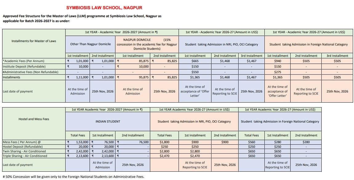Earlier, L.L.M Business And Corporate Law fees at Symbiosis Law School Nagpur was ₹ 2.01 Lakhs (in 2025) for the entire course duration. This shows a fee increase of ₹ 4 Lakhs over the year.