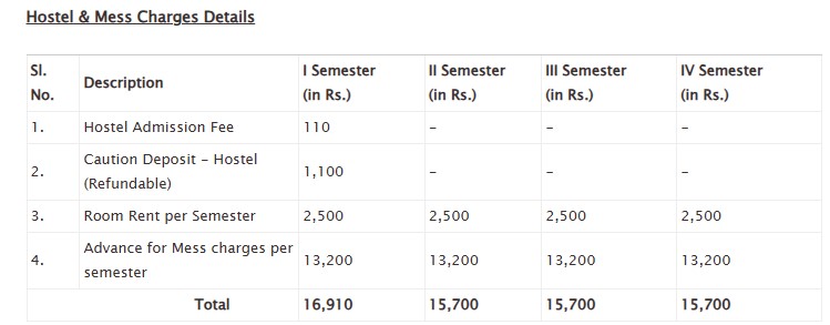 Boys hostel is two sharing bedrooms, with a common bathroom in each floor. They provide 1 bed , cot, table and chair for each person. New girls hostel is identical to this but old girls hostel has 3 sharing rooms with an attached bathrooms. The hostel has a gym and study area. Hot water is not available, sometimes there is water shortage. The menu has non veg twice a week. Also egg is available twice a week. There has been reports of worms being found in hostel food. The registration for hostel will be open online once your admission is confirmed. For breakfast you will get dosa, idly, allo poratha etc. Dinner is usually roti. Almost everyone will get hostel rooms. There isn't any good PGs available nearby.