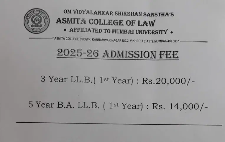 Asmita College of Law Mumbai BA + L.L.B is offered as 5 Years Full Time program. The minimum eligibility criteria for BA + L.L.B is 10+2 with 45% + MAH-LLB CET. The total fees for Asmita College of Law Mumbai BA + L.L.B in 2025 is ₹ 70,000 for the complete course duration, which includes total tuition fees of ₹ 70,000.