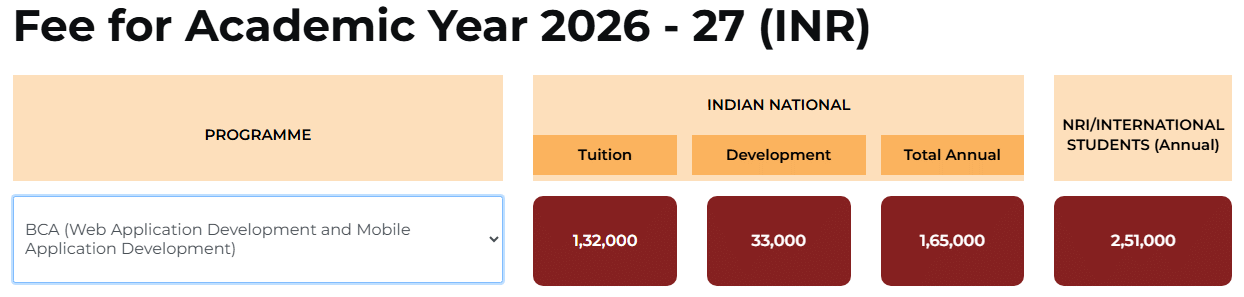 09 Dec, 2025 School of Engineering and Technology, NCU Gurgaon has released Fee Structure 2026-27 for the BCA Web Application Development Programs. The total academic fees is ₹ 5.08 Lakhs.