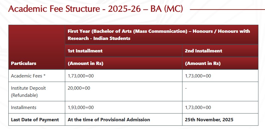 Earlier, BA {Hons.} Mass Communication fees at Symbiosis Center for Media And Communication Pune was ₹ 20.96 Lakhs (in 2024) for the entire course duration. This shows a fee decrease of ₹ 6.92 Lakhs over the year.