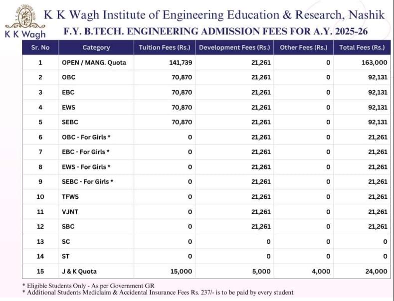 KK Wagh Education Society B.Tech {Lateral} Mechanical Engineering fees in first year is ₹ 1.63 Lakhs. The detailed fees is mentioned below.Check KK Wagh Education Society Admission 2025