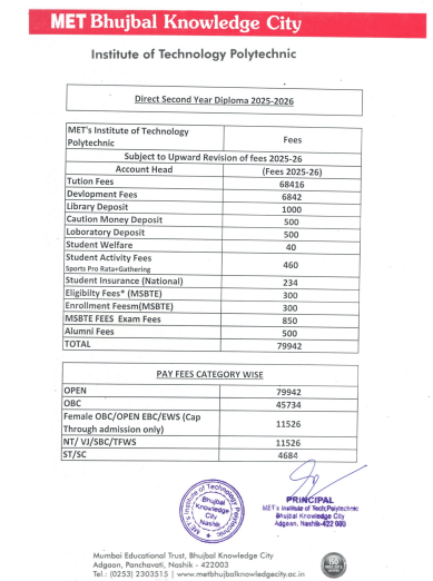 MET’s Institute of Technology, Polytechnic Nashik Lateral Polytechnic Information Technology fees in first year is ₹ 79,842. The detailed fees is mentioned below.