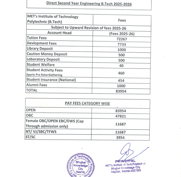 MET’s Institute of Technology, Polytechnic Nashik B.Tech {Lateral} Civil & Enviromental Engineering fees in first year is ₹ 83,954. The detailed fees is mentioned below.