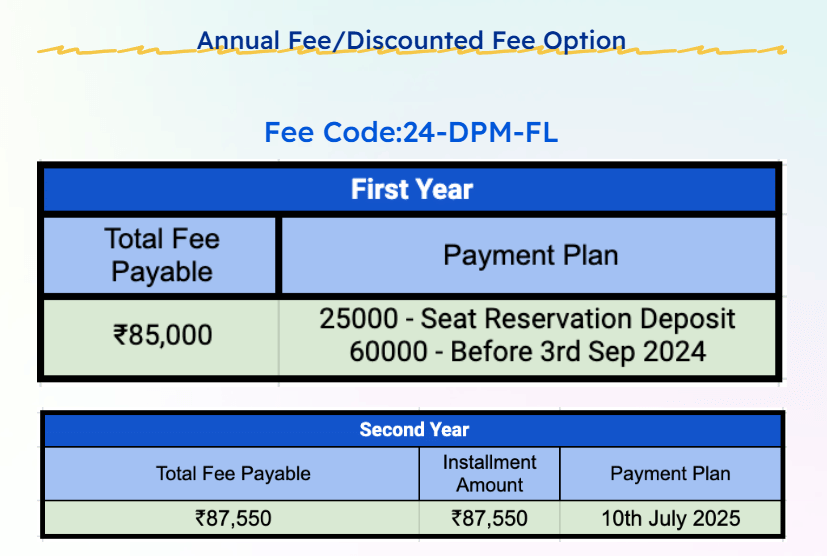 The total course fee is INR 220,000 for a 2-year duration, with a flexible and well-structured payment plan. Scholarships are offered based on students' previous academic achievements.