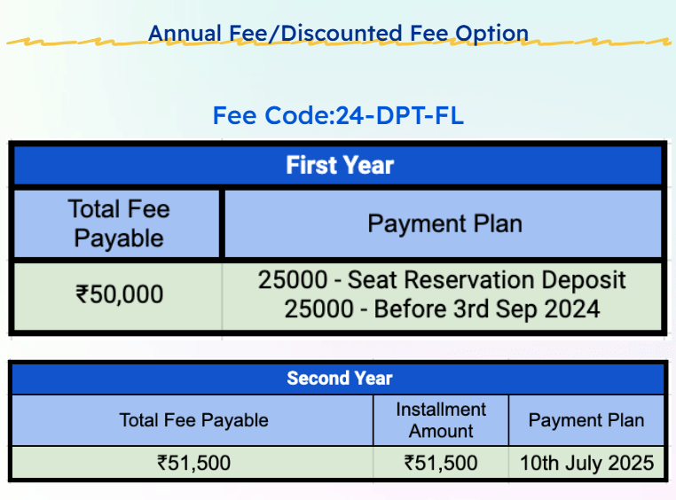 Earlier, Diploma Physiotherapy fees at NIMT Greater Noida was ₹ 1.38 Lakhs (in 2023) for the entire course duration. This shows a fee decrease of ₹ 36,800 over the year.