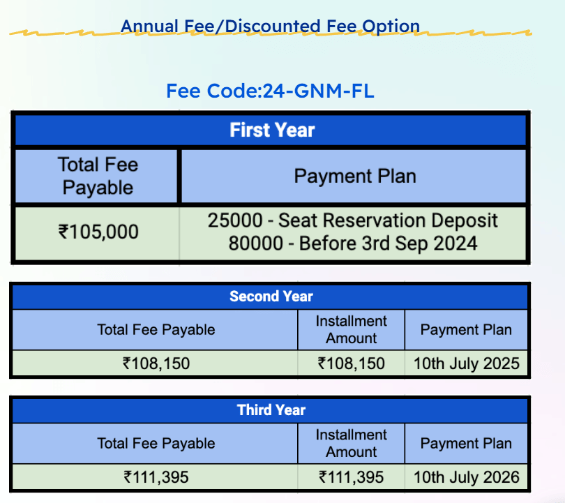 Earlier, GNM fees at NIMT Greater Noida was ₹ 2.96 Lakhs (in 2023) for the entire course duration. This shows a fee increase of ₹ 28,421 over the year.