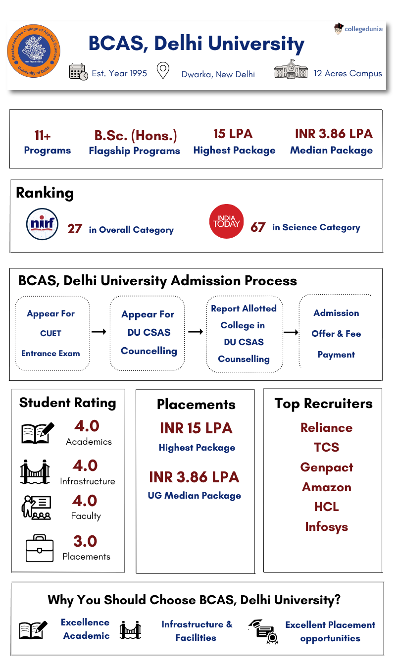 Bhaskaracharya College of Applied Sciences is a constituent public college of the University of Delhi and was established in 1995. The college has been accredited by NAAC with an A grade, and it is spread over an area of 12 acres. According to the NIRF report 2025, BCAS has ranked 37 out of 300 colleges in the Overall Category. This includes the central library, sports ground, canteen, computer, and Wi-Fi etc. Bhaskaracharya College currently offers B.Sc (Hons.) in multiple specialisations. The admission to the UG courses is carried out based on the candidate’s performance in CUET UG. After qualifying in the entrance exam, candidates have to appear in the centralised DU CSAS process for seat allocation.
