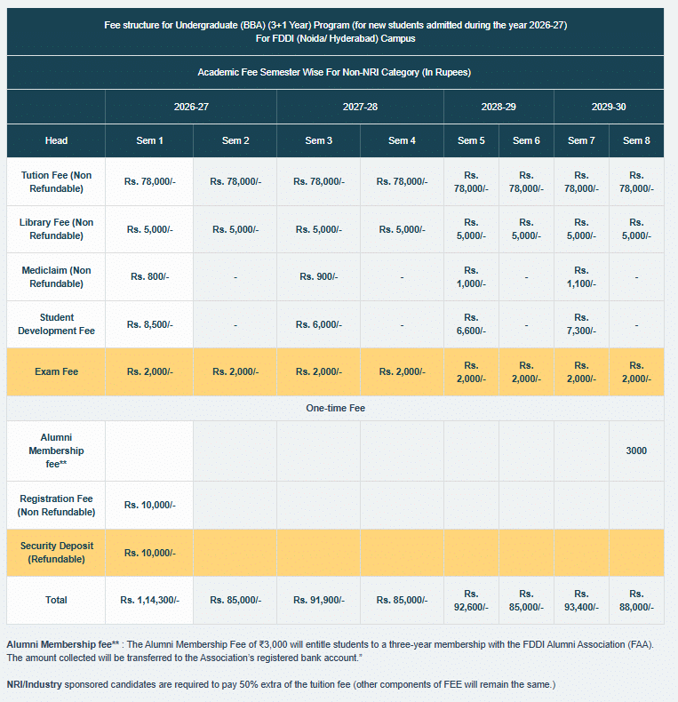 16 Jan, 2026 FDDI Hyderabad BBA {Hons.} Retail Management Fee Structure 2026-27 has been released. The total academic fee is ₹ 7.32 Lakhs. Check details.