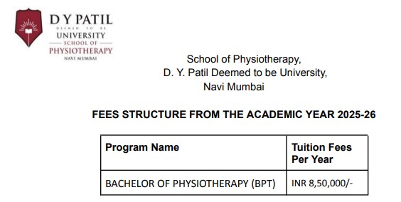 30 Jun, 2025 DY Patil School of Physiotherapy Navi Mumbai B.P.T Fee structure 2025-26 has been released. The academic fee is ₹ 8.5 Lakhs/Yr.