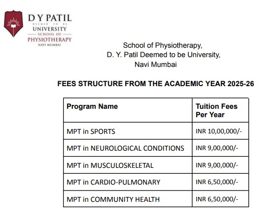 30 Jun, 2025 DY Patil School of Physiotherapy Navi Mumbai Fee structure 2025-26 has been released for M.P.T Musculoskeletal programs. The academic fee is ₹ 9 Lakhs/Yr.