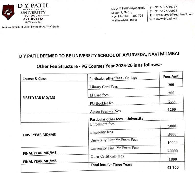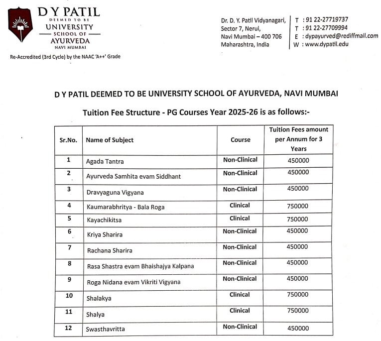 30 Jun, 2025 DY Patil University, School of Ayurveda Navi Mumbai has released the Fee structure 2025-26 for M.D Kaumarbritya programs. The academic fee is ₹ 7.72 Lakhs/Yr.