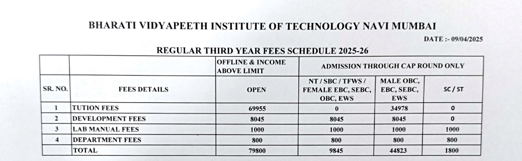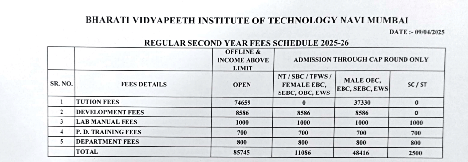 Bharati Vidyapeeth Institute of Technology Navi Mumbai Polytechnic Chemical Engineering Fee has not been released yet. For reference you can check the previous year academic fees in the section below.