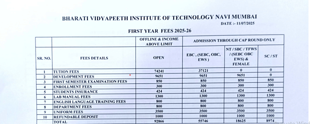 Bharati Vidyapeeth Institute of Technology Navi Mumbai Polytechnic Chemical Engineering is offered as 3 Years Full Time program, with total intake of 30 seats. The minimum eligibility criteria for Polytechnic is 10th. The total fees for Bharati Vidyapeeth Institute of Technology Navi Mumbai Polytechnic Chemical Engineering in 2021 is ₹ 2.31 Lakhs for the complete course duration, which includes total tuition fees of ₹ 2.31 Lakhs.