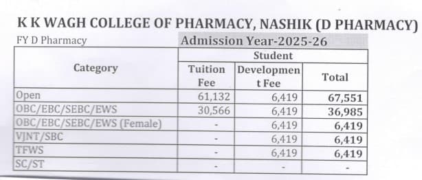 Earlier, D.Pharm Pharmacy fees at K. K. Wagh College of Pharmacy Nashik was ₹ 1.89 Lakhs (in 2024) for the entire course duration. This shows a fee decrease of ₹ 53,898 over the year.