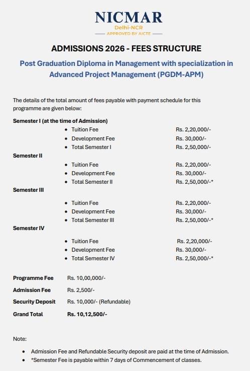 PG Diploma Construction Management Fees at NICMAR Delhi covers a range of expenses, including tuition fee, course materials, and access to campus facilities.