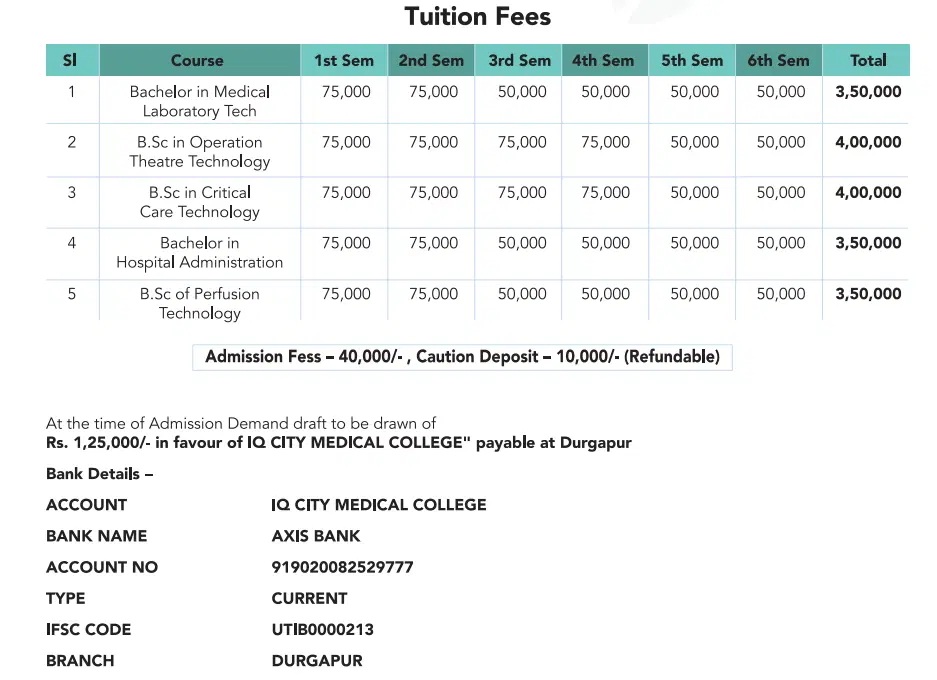 IQ City Medical College Durgapur BHA is offered as 3 Years Full Time program, with total intake of 30 seats. The minimum eligibility criteria for BHA is 10+2. The total fees for IQ City Medical College Durgapur BHA in 2025 is ₹ 4 Lakhs for the complete course duration, which includes total tuition fees of ₹ 3.5 Lakhs. Earlier, the fees in 2023 - 2024 for BHA was ₹ 5.25 Lakhs.