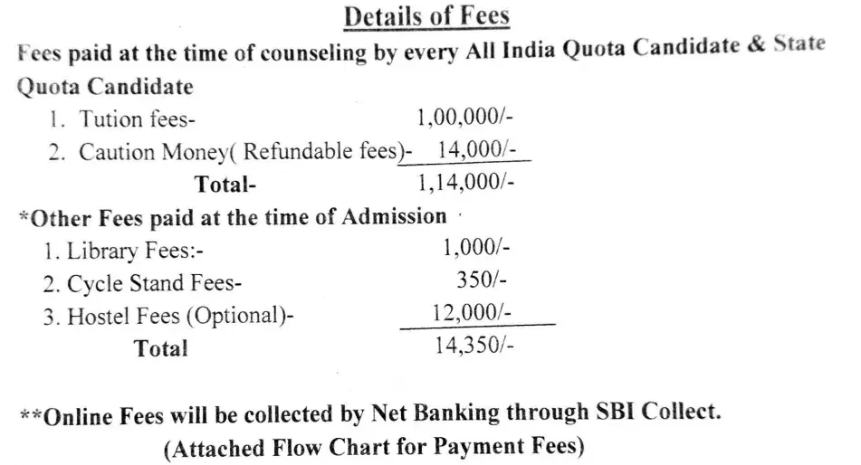 Government-funded scholarships are available for reserved categories (SC, ST, OBC, and minorities), while All India Quota students pay the full fee. Scholarships like Medhavi Chhatra Yojna and Post-Matric cover tuition fees and sometimes hostel fees for eligible students. The total cost for the entire course is approximately Rs 5.5 lakhs.