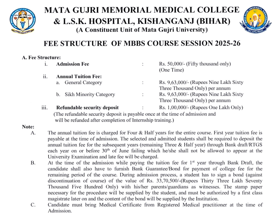 11 Nov, 2025 Mata Gujri Memorial Medical College & Lions Seva Kendra Hospital Kishanganj MBBS Fee Structure 2025-26 has been released. The total academic fee is ₹ 74.65 Lakhs.