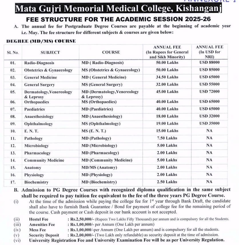 Mata Gujri Memorial Medical College & Lions Seva Kendra Hospital Kishanganj Hostel Fee is ₹ 3 Lakhs.