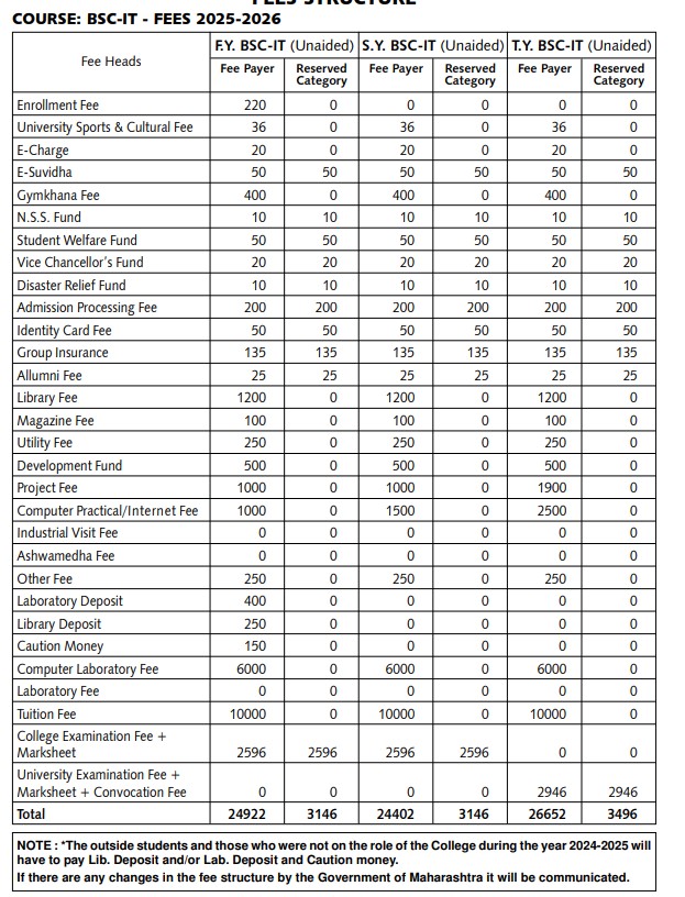 Tuition fees are 25,000 INR per year, payable in two installments, but significantly reduced to 2,000 INR per year for SC, ST, and other non-general and non-OBC students. Additional costs include 250 INR for development, 350 INR for lab experiments, 200 INR for registration, plus charges for library and ID cards. There's no caution fee required.