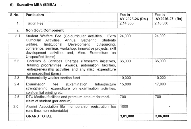 Earlier, EMBA fees at DSM DTU was ₹ 5.81 Lakhs (in 2024) for the entire course duration. This shows a fee increase of ₹ 26,300 over the year.