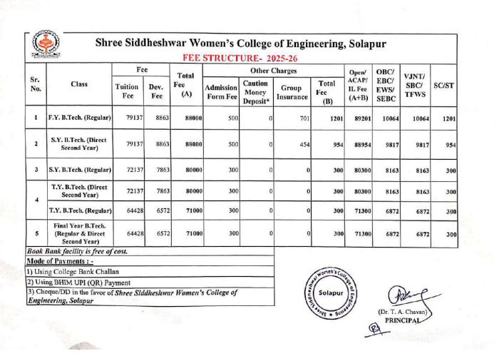 Shree Siddheshwar Women’s College of Engineering Solapur B.Tech Computer Science and Engineering - Artificial Intelligence and Data Science fees in first year is ₹ 89,201. The detailed fees is mentioned below.Hostel Fee for Female at Shree Siddheshwar Women’s College of Engineering Solapur is ₹ 13,000.