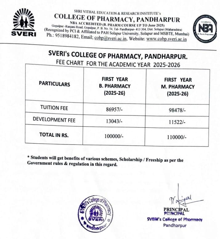 SVERI's College of Pharmacy Solapur M.Pharm Pharmaceutics is offered as 2 Years Full Time program, with total intake of 12 seats. The minimum eligibility criteria for M.Pharm is B.Pharm + GPAT. The total fees for SVERI's College of Pharmacy Solapur M.Pharm Pharmaceutics in 2025 is ₹ 2.2 Lakhs for the complete course duration. Earlier, the fees in 2022 - 2023 for M.Pharm Pharmaceutics was ₹ 1.62 Lakhs.