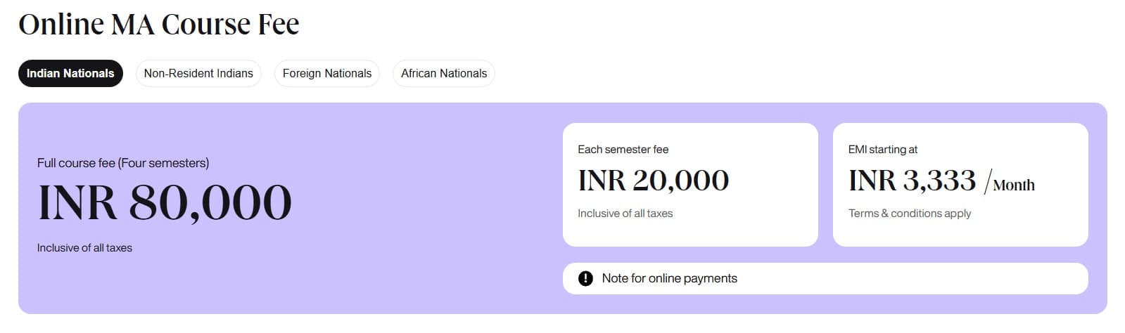 For students applying under the NRI quota for admission, the total course fee for M.A Economics at Manipal University Online is ₹ 1.04 Lakhs.