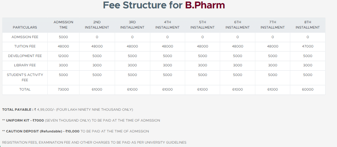 Earlier, B Pharma fees at Gitanjali College Of Pharmacy Nalhati was ₹ 4.99 Lakhs (in 2025) for the entire course duration. This shows a fee increase of ₹ 17,000 over the year.