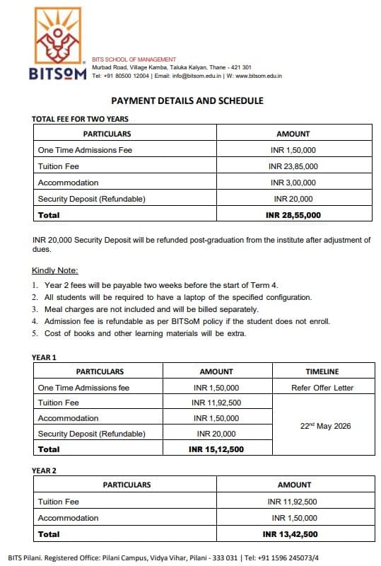 - Candidates need to pay INR 13.63 Lakhs in the first year.