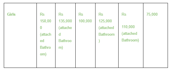 2 seater = Two Bed, 2 Study Table, Chair, 2 Chairs, Cooler, Curtains 2 Personal Wardrobes, Attach Washrooms (+cooler for non ac)