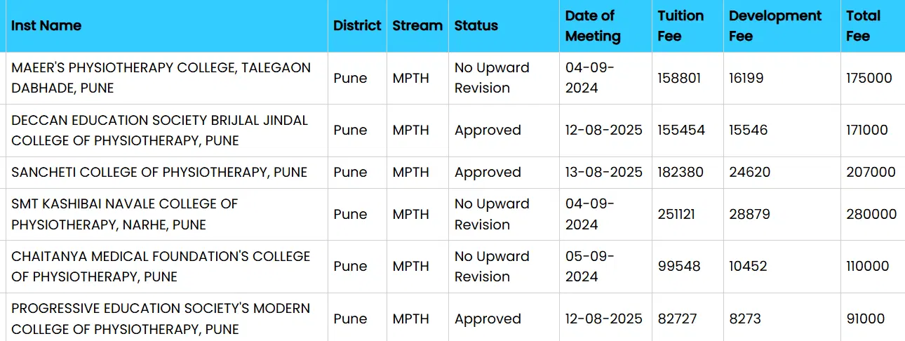 PES's Modern College of Physiotherapy Pune M.P.T Community Physiotherapy fees in first year is ₹ 91,000. The detailed fees is mentioned below.PES's Modern College of Physiotherapy Pune offers a total of 2 seats for M.P.T Community Physiotherapy.