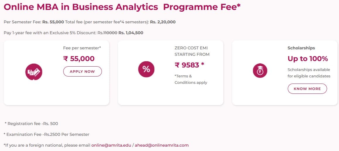 Amrita Ahead Online Kollam MBA Business Analytics fees 2025 is ₹ 2.31 Lakhs for the entire course duration.