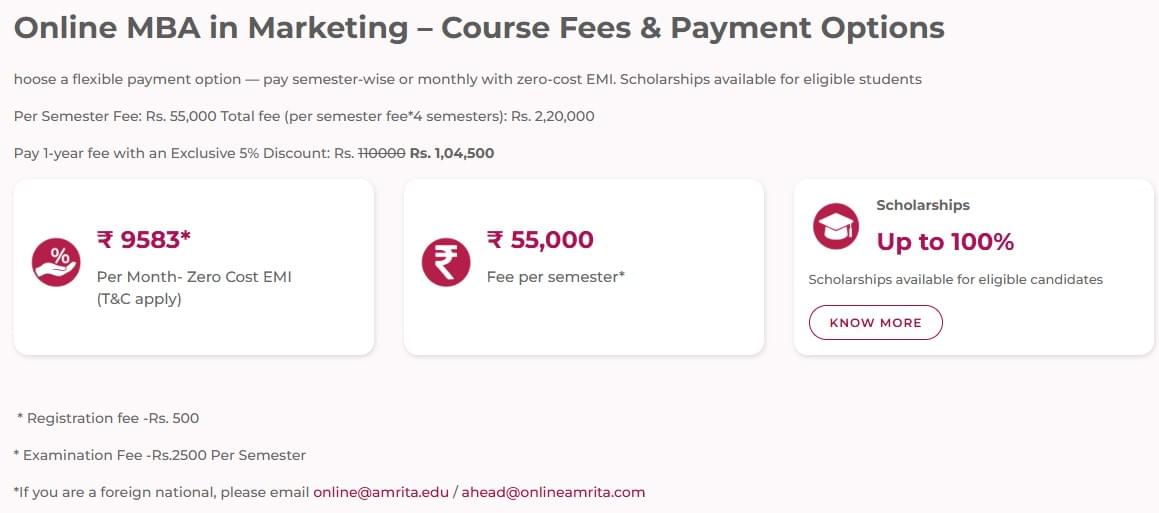 Amrita Ahead Online Kollam MBA Marketing fees 2025 is ₹ 2.31 Lakhs for the entire course duration.