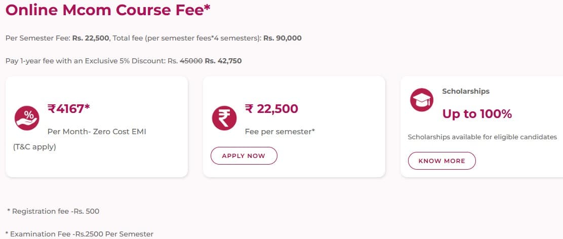 Earlier, M.Com Finance fees at Amrita Ahead Online Kollam was ₹ 90,000 (in 2024) for the entire course duration. This shows a fee increase of ₹ 10,500 over the year.