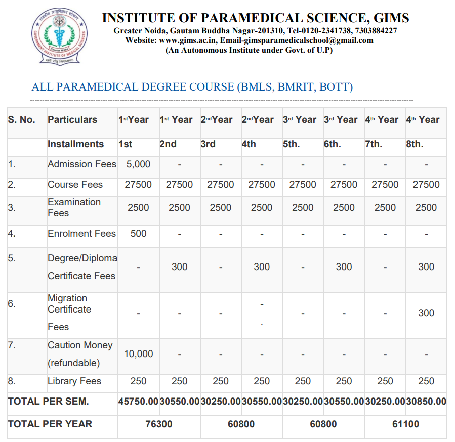 GIMS BMLT is offered as 3 Years Full Time program. The minimum eligibility criteria for BMLT is 10+2 + CPET. The total fees for GIMS BMLT in 2025 is ₹ 1.98 Lakhs for the complete course duration, which includes total tuition fees of ₹ 1.65 Lakhs.