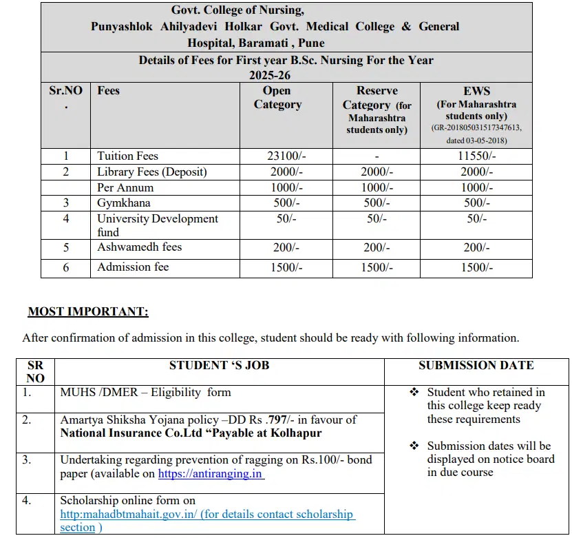 Government Medical College Baramati B.Sc (Nursing) Nursing fees in first year is ₹ 28,350. The detailed fees is mentioned below.Government Medical College Baramati Hostel Fee is ₹ 4,000.