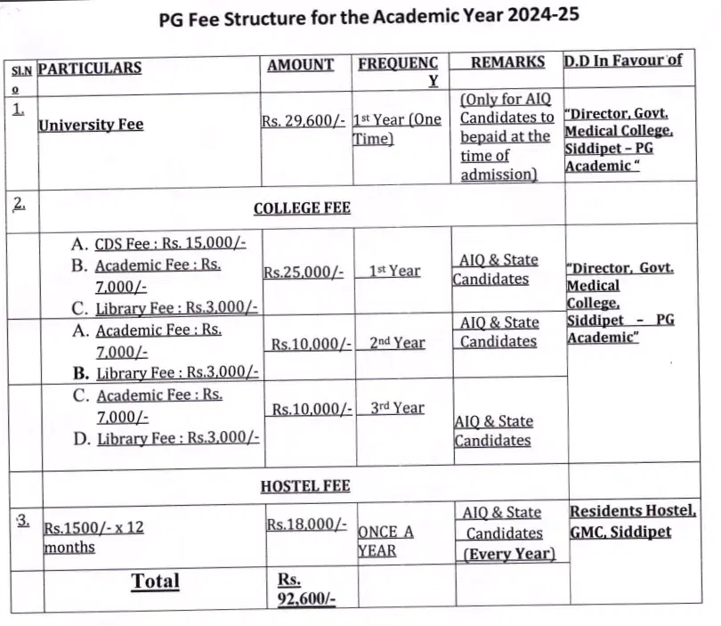 Government Medical College Siddipet M.S Anatomy fees 2025 is ₹ 1.29 Lakhs for the entire course duration.