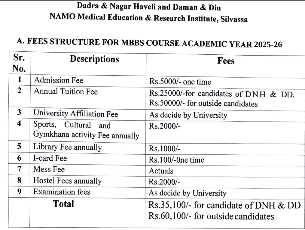 The course, accommodating 180 students, is led by one faculty member using audio-visual tools and screens to aid learning. Students undergo two internal exams and a preliminary test before the university exams. After 4.5 years, or nine semesters, students qualify for internships at primary health centers and Shri Vinoba Bhave Civil Hospital. Graduates can work as medical officers in Dadra Nagar Haveli and Daman and Diu. Each student is guaranteed an internship with a stipend of 20,000 INR.