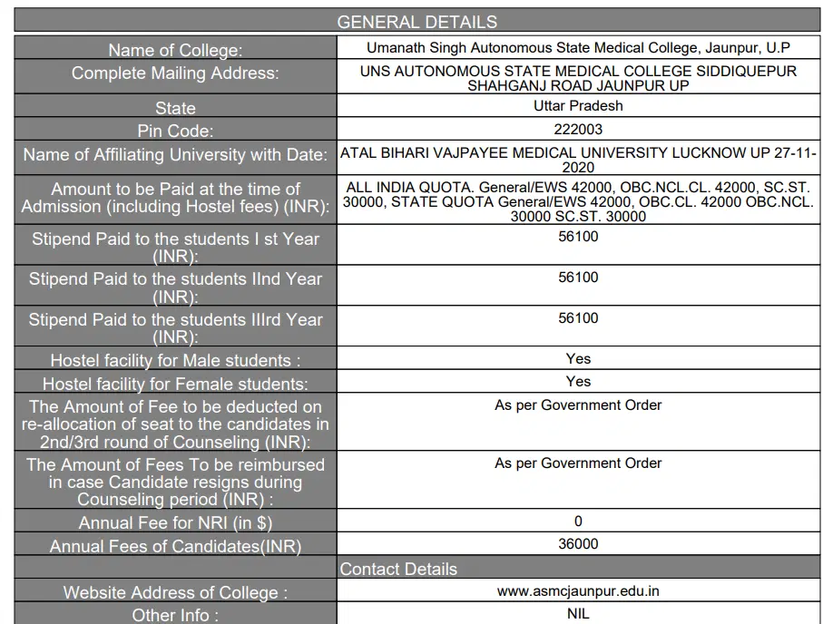 Uma Nath Singh Autonomous State Medical College Jaunpur Hostel Fee is ₹ 4,800.