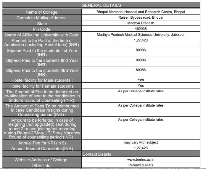 Bhopal Memorial Hospital & Research Centre Hostel Fee is ₹ 1,200.
