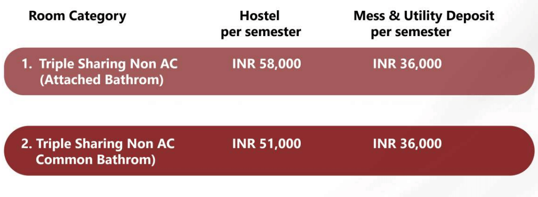 Room provides essentials for student life such as beds,tables,proper beds and proper sanitary washrooms. Meal quality is excellent with a variety of meals given 3 times per day Registration is pretty easy