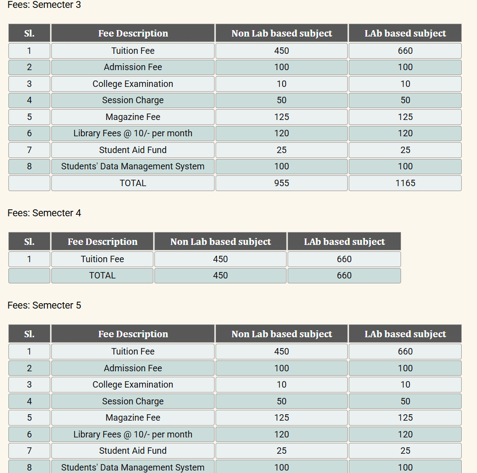 Semester fees for science courses range from Rs. 1600 to Rs. 1900, and even less for other disciplines. The total course cost over three years is about Rs. 3750, excluding exam fees. While the college has a placement cell, it does not organize placements for the Microbiology course. However, faculty offer career guidance. Female students may benefit from the Kanyashree Prakalpa program, providing Rs. 25,000 over three years, and the Swami Vivekananda Scholarship worth Rs.